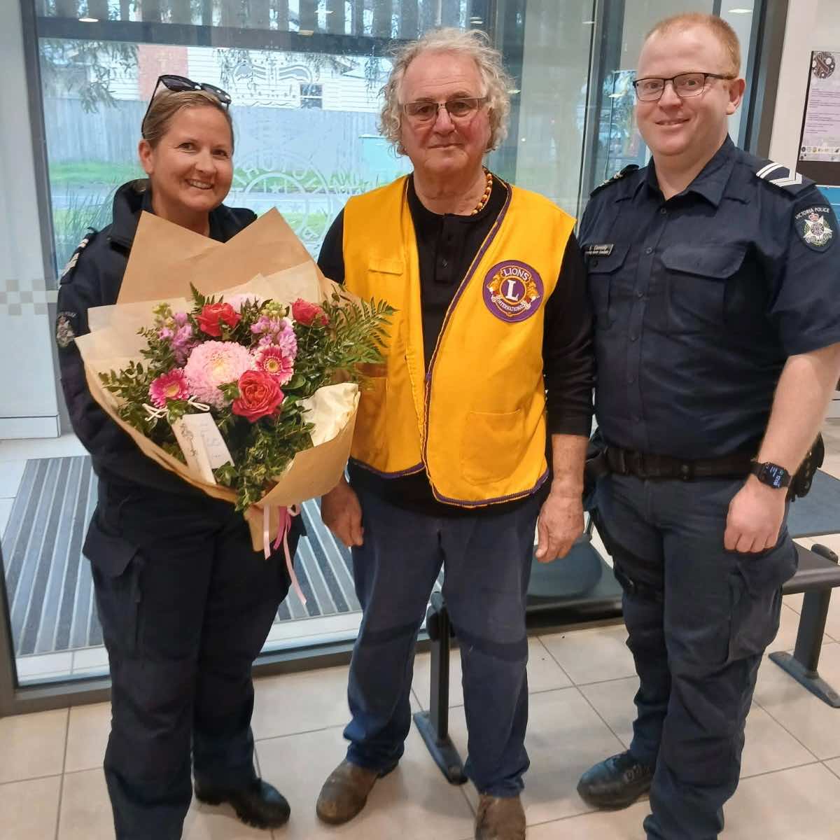 Allen Osman, a retired police member, presented flowers to the police on behalf of the Torquay Lions Club.