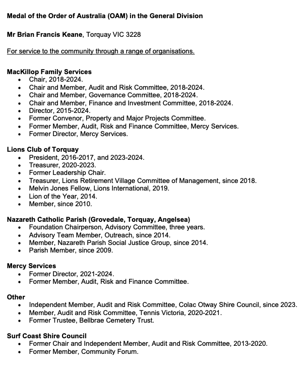 Torquay Lions Club member Brian Keane received an OAM in this years Australia Day Awards for services to a range of community organisations. These included MacKillop Family Services, Lions Club of Torquay, Nazareth Catholic Parish and Surf Coast Shire Council.