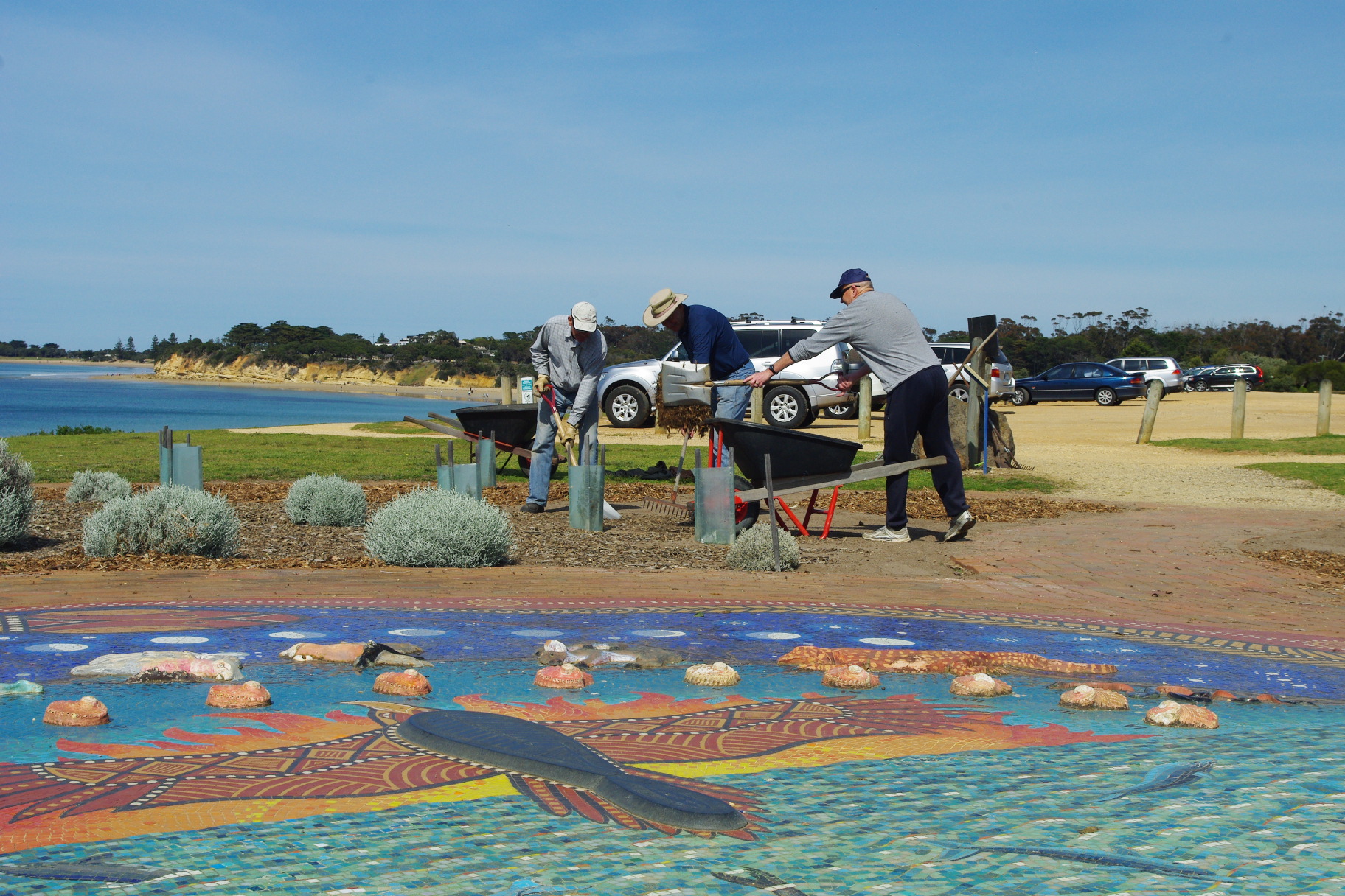 The Analemmatic Sundial on the Torquay Foreshore at Fisherman's Beach was designed and made by local artists, using 120,000 coloured ceramic tiles to depict traditional dreaming stories of the Wathaurong indigenous people. Routine maintenance is provided by the Lions Club.